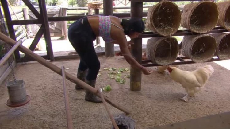"Olha o tomate", Aline conversa com as aves durante o trato com os animais - A Fazenda 13