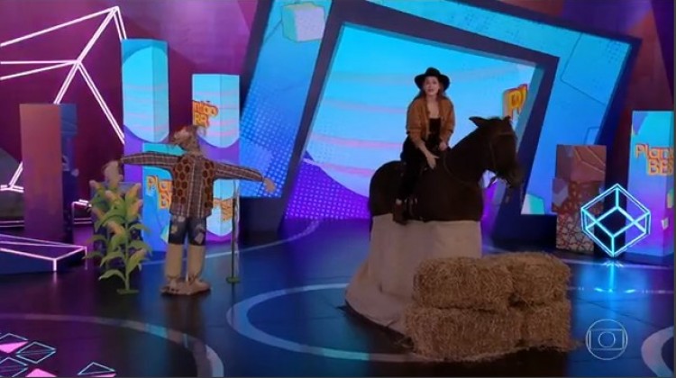 Em homenagem ao líder Caio, Ana Clara apresentou o 'Plantão BBB' de peoa, com direito a cavalo cenográfico — Foto: TV Globo