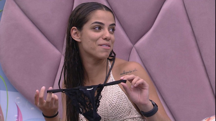 Gustavo também presenteia a sister com uma cueca dele. "Troca justa, né", fala o agroboy, enquanto Key Alves cai na risada e olha a peça íntima do brother.